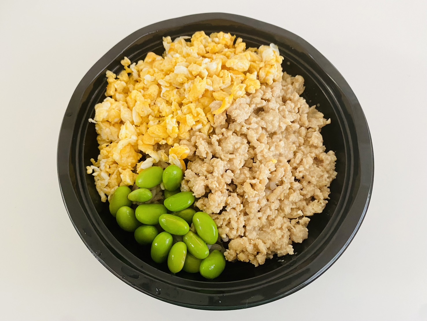 鶏そぼろ、炒り卵、菜の花(画像の枝豆から変更されています)の三色丼。ご飯は120g。